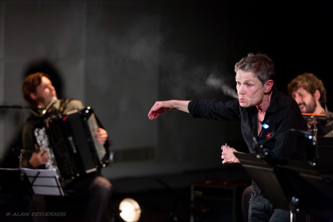 Une affaire jouée-chantée-lue-vécue, avec musique permanente. En trio.