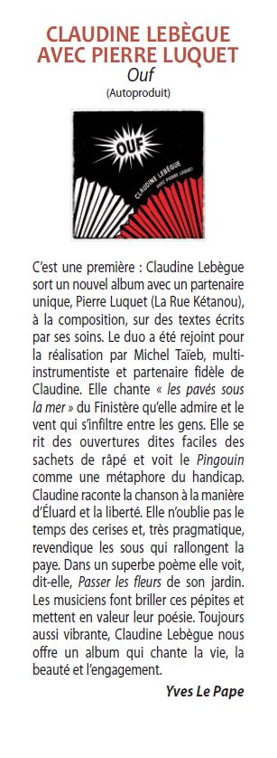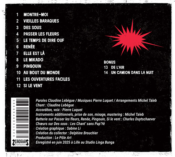 Je suis auteure des textes, les musiques sont de Pierre Luquet (Pierrot de La rue Ketanou) accordéoniste compositeur au tempérament bien trempé et au groove incontesté. Notre collaboration a donné naissance à douze chansons dansantes, portées par une énergie entre intensité, poésie et liberté musicale. C’est brut, sincère, vivant.